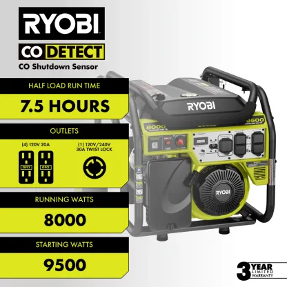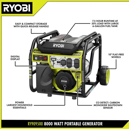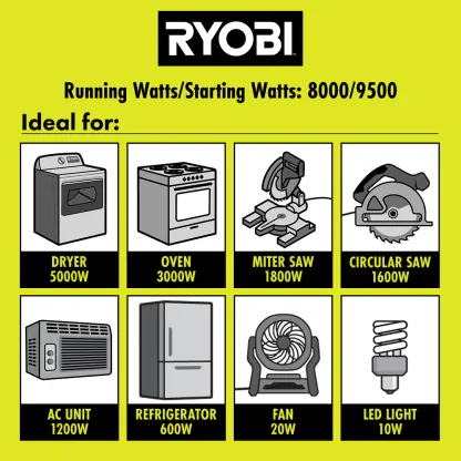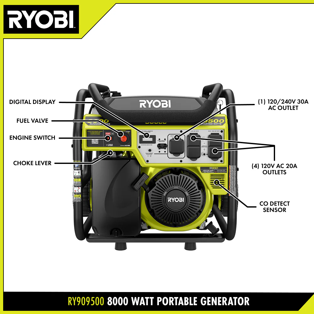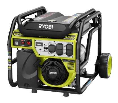 The RYOBI 8000 Watt Portable Generator confidently powers your largest home essentials when you need them most. Featuring a powerful 500cc OHV engine, this generator delivers 8000 running watts and 9500 starting watts, allowing you to run everything from large appliances and A/C units to heaters and heavy-duty corded power tools. Ideal for use on jobsites and for storm backup, this generator is a reliable source of power for demanding job site tasks and home power outages. The six gallon fuel tank offers up to 7.5 hours of runtime at 50% load, providing extended runtime without the need for frequent refueling. Power multiple devices simultaneously using the four 120V 20A GFCI-protected household outlets and one 120V/240V 30A twist-lock outlet. Conveniently track your voltage, frequency, total run hours, and service reminders with the integrated digital display. The built-in CO Detect carbon monoxide shutdown sensor automatically shuts down the generator when dangerous carbon monoxide levels are detected. Designed for convenience, the generator features a durable hand truck frame, 10” flat-free wheels, and fold-down quick-release handles for easy mobility and compact storage. This tool is backed by the RYOBI 3-Year Manufacturer’s Tool Warranty and includes 8000 Watt Portable Generator, 10” Flat-Free Wheels, Feet, Engine Lubricant, Assembly Hardware, and Operator’s Manual.