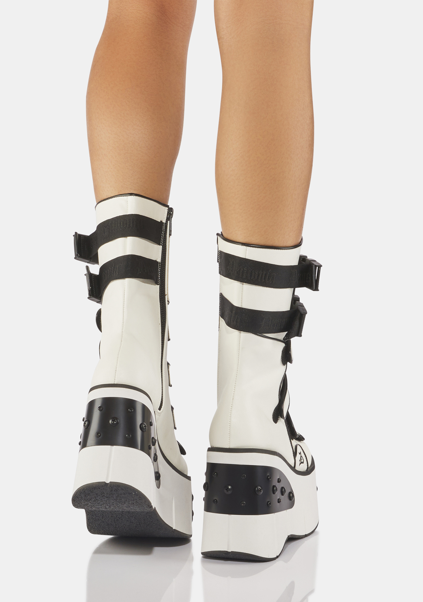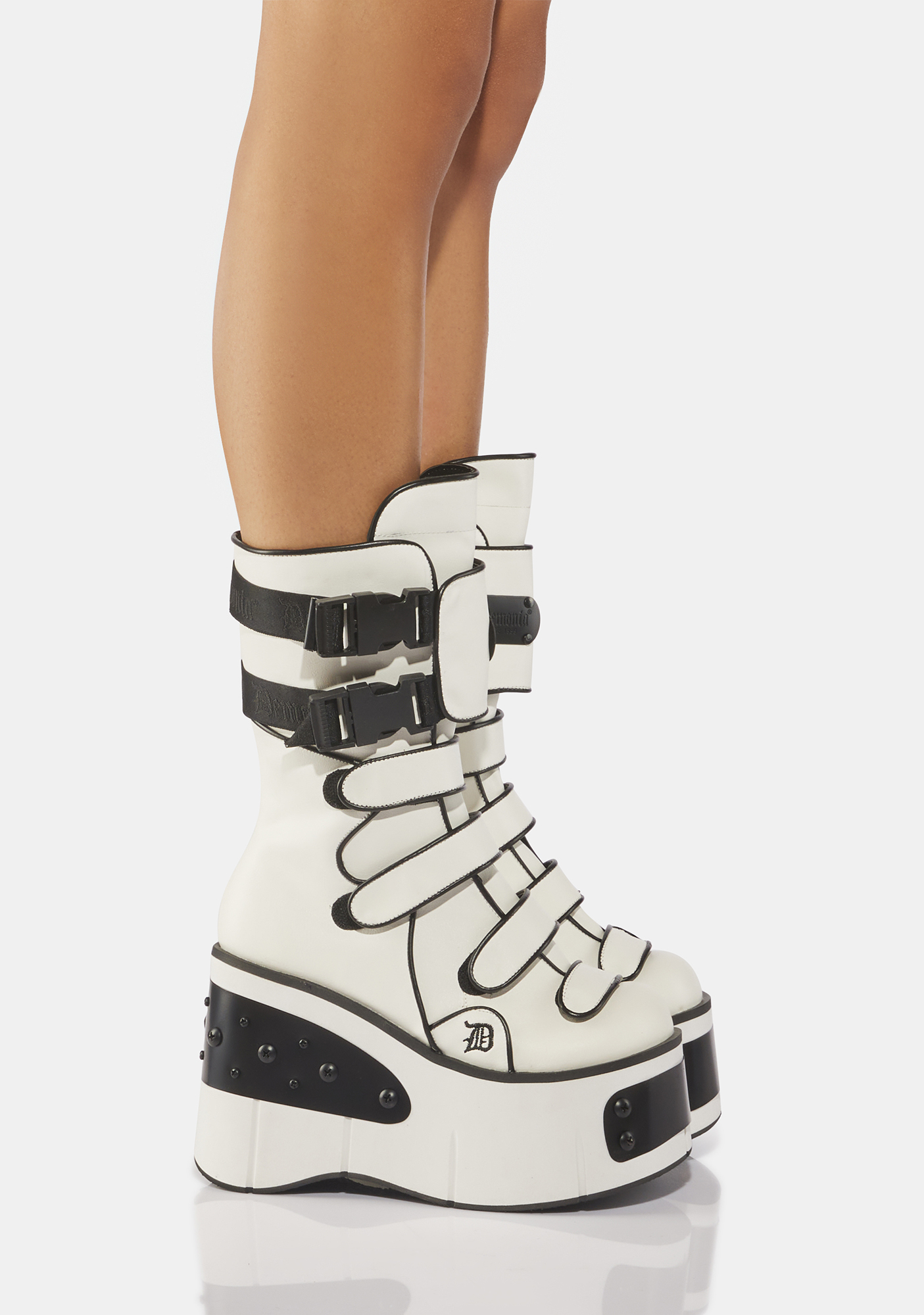 Reckoned Forces Platform Boots cuz you’re causing a storm, babe. These platform boots have a vegan leather construction, front and back metal plated details, detachable shields with buckle closures, adjustable hook and loop straps, and side zip closures.