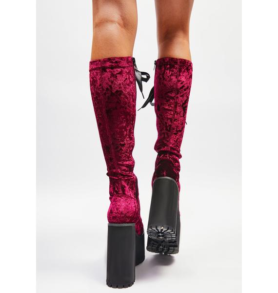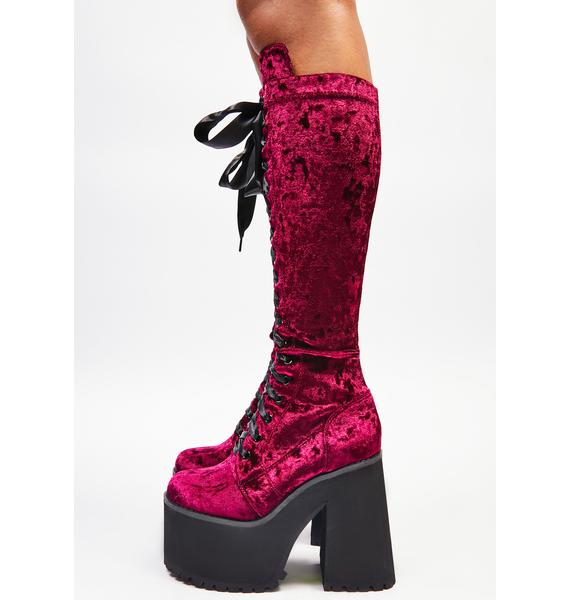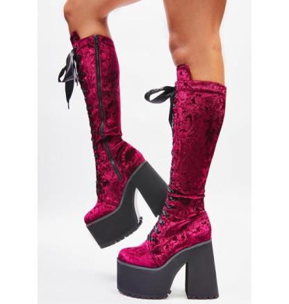 Widow Bloodlust Velvet Knee High Boots cuz what’s the point of showing mercy? These velvet knee high boots have chunky heeled platform soles, side zip closures, and adjustable ribbon lace-ups on the front.