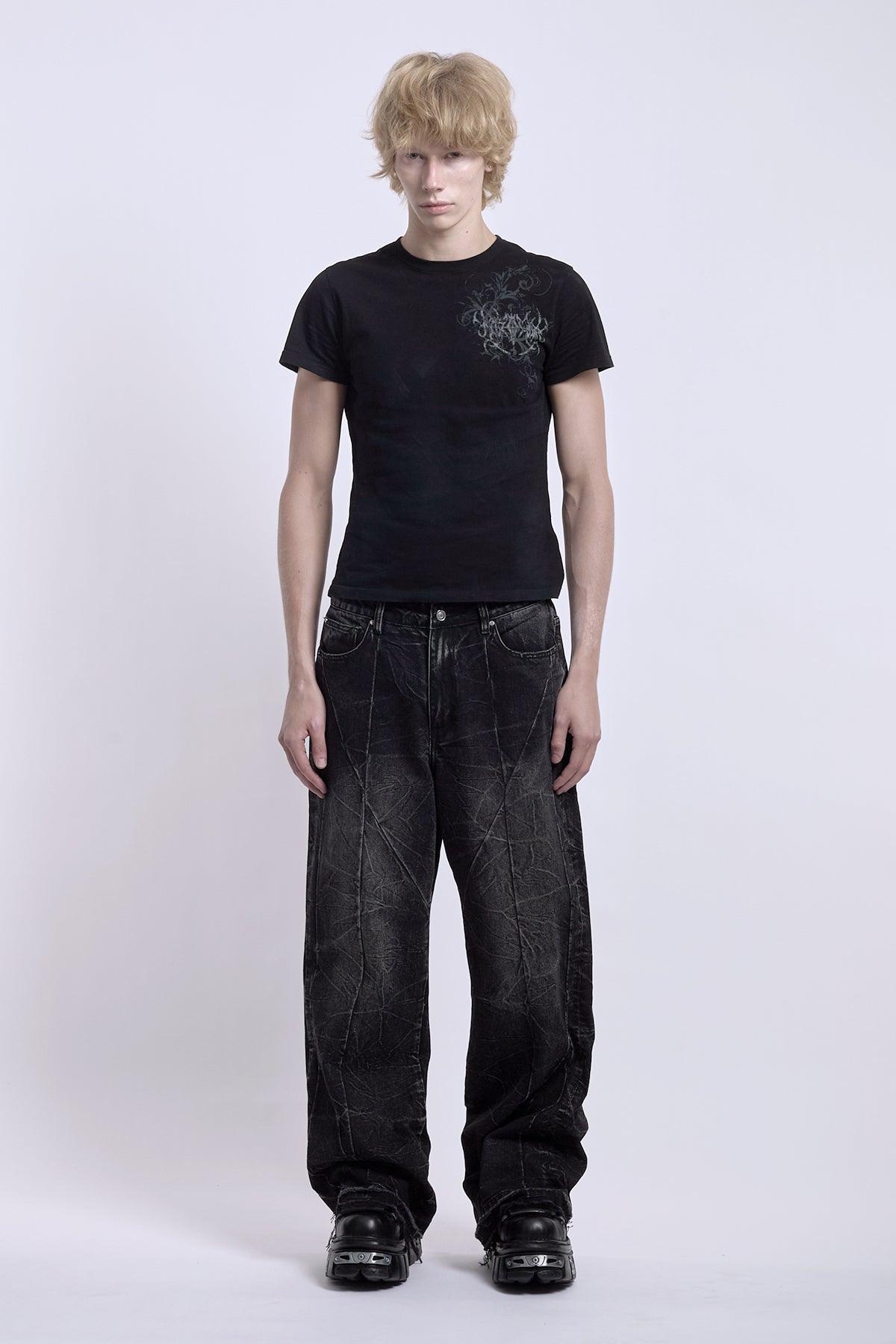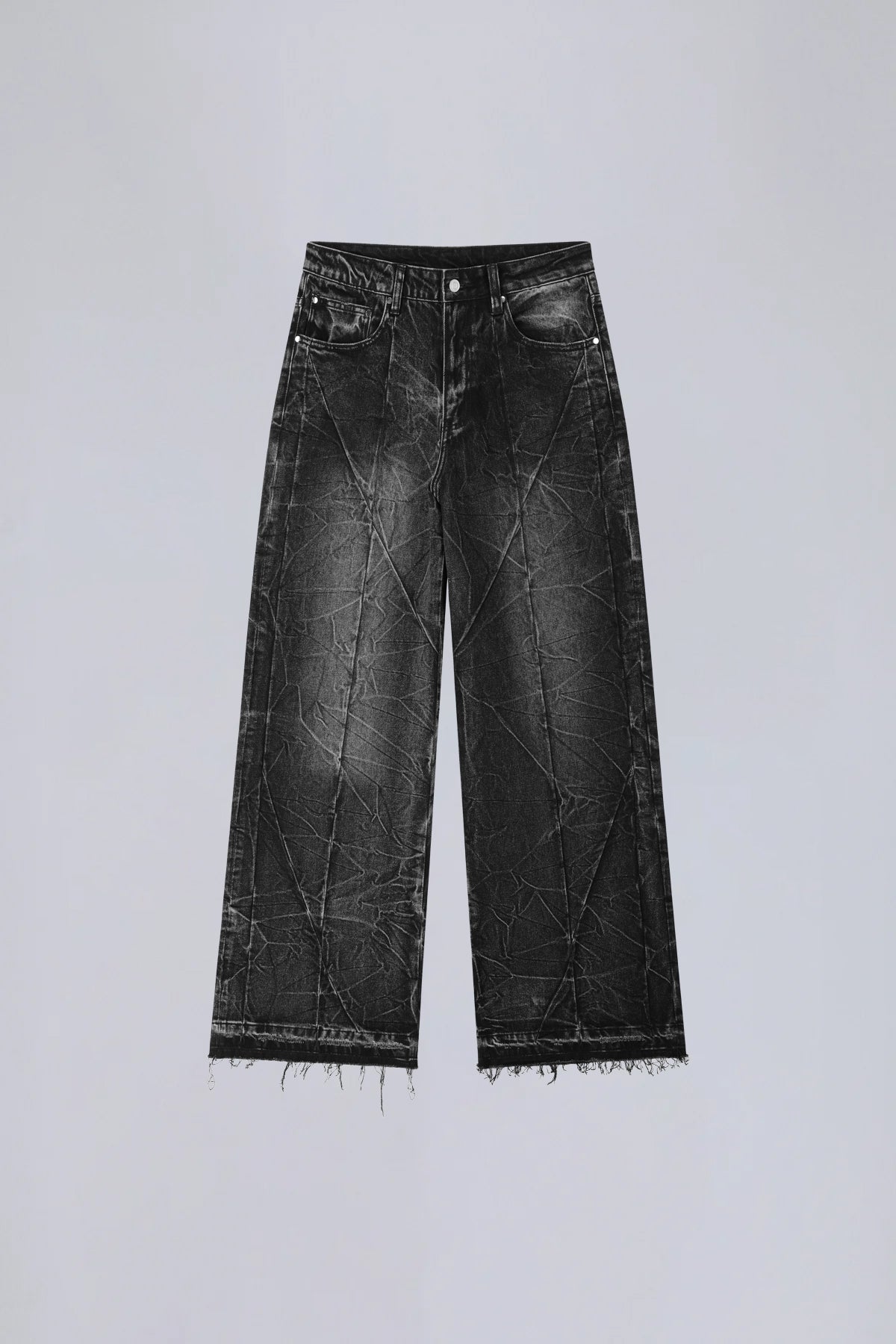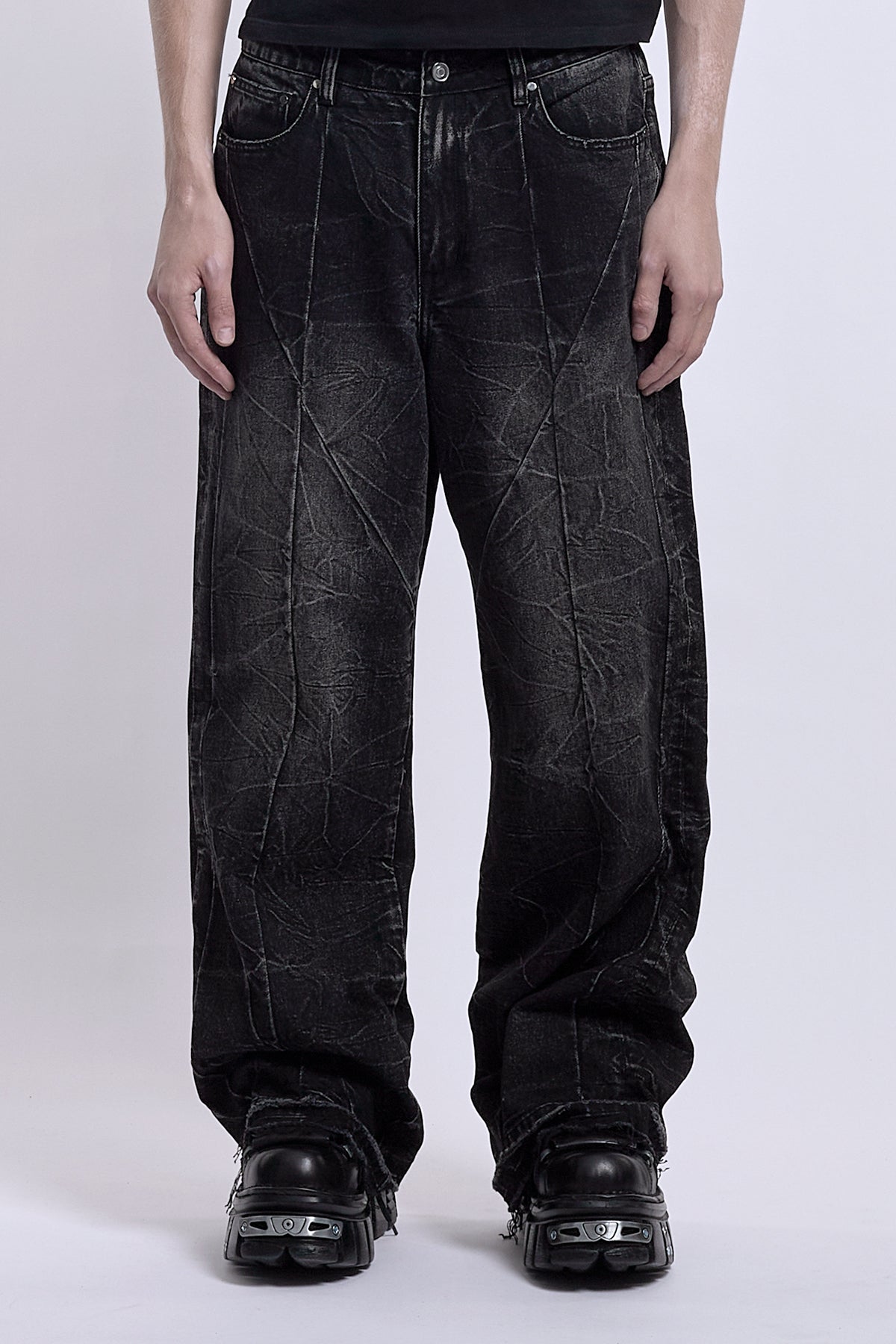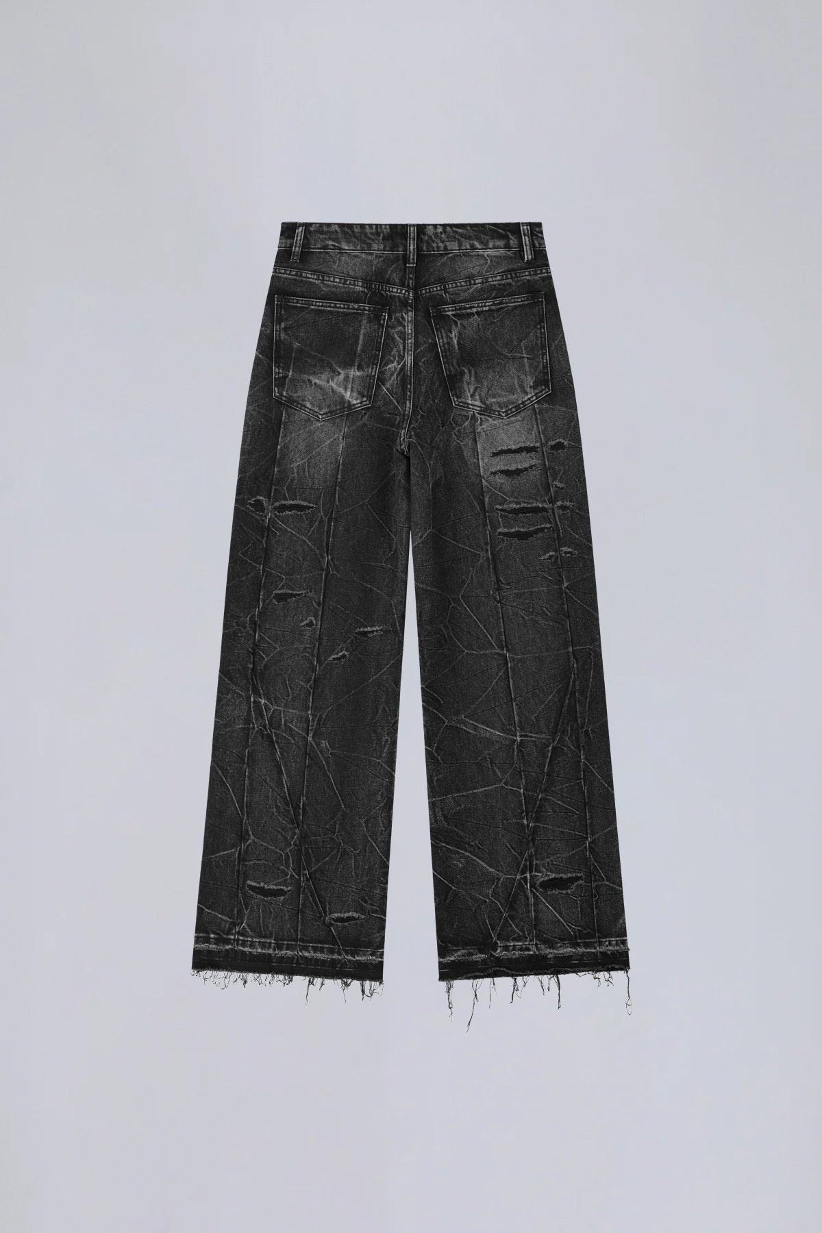 Whiskered + distressed denim jeans with rips. Decorative seams. Distressed bottom hem with loose threads.