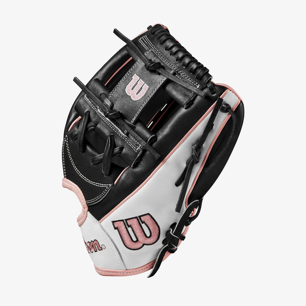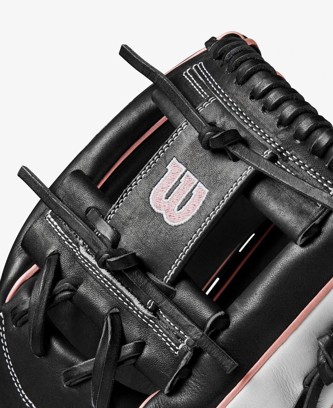 Range up the middle or extend down the third base line with the A2000 H12, a 12” softball glove designed to help infielders secure hard-hit line drives and scorching ground balls. The 12” reach offers the extra length needed to make backhand plays, and Black & White Pro Stock® leather delivers a soft feel and long-lasting performance. The shallow pocket design and H-Web construction makes it easy to quickly transfer and throw the ball to any base. Rose gold accents spotlight your style, and the drawstring wrist closure is easily adjustable to create a snug fit.